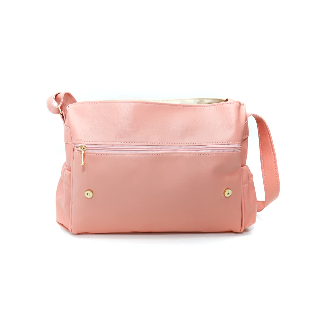 Possui bolso interno e espaço grande para roupas, fraldas etc. Contém dois bolsos laterais para garrafas ou mamadeiras. Na parte de fora, possui bolso frontal com fechamento em ziper, e uma aba para fechamento da bolsa com botões de pressão (metais dourados). Acompanha trocador.